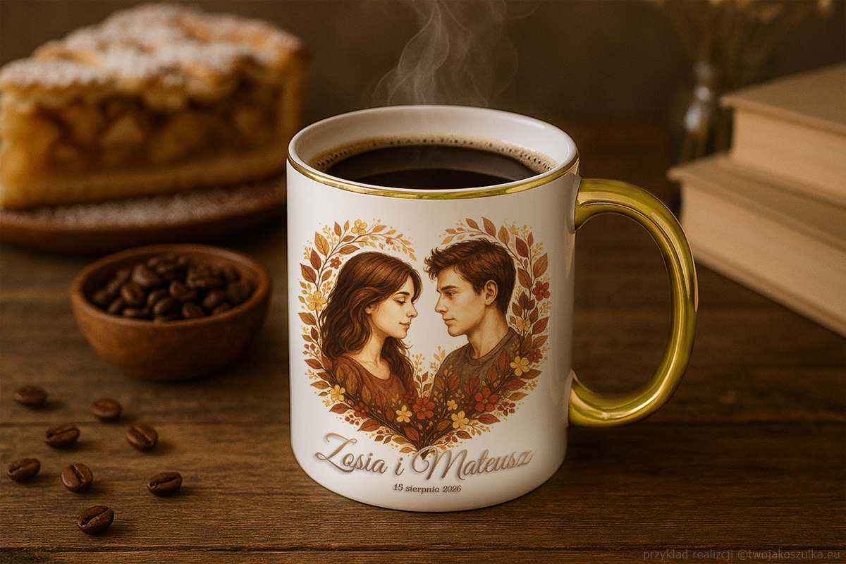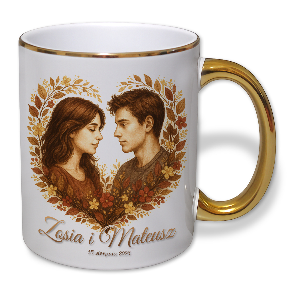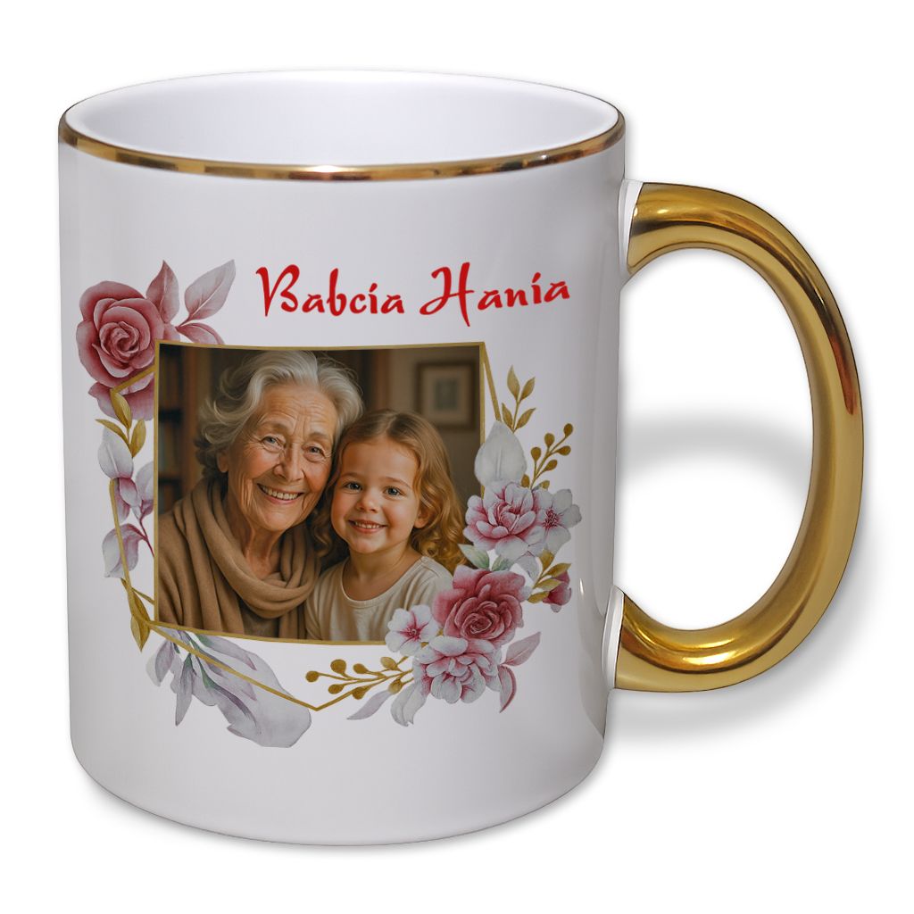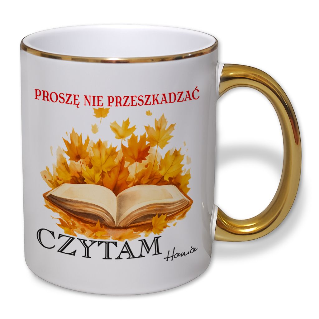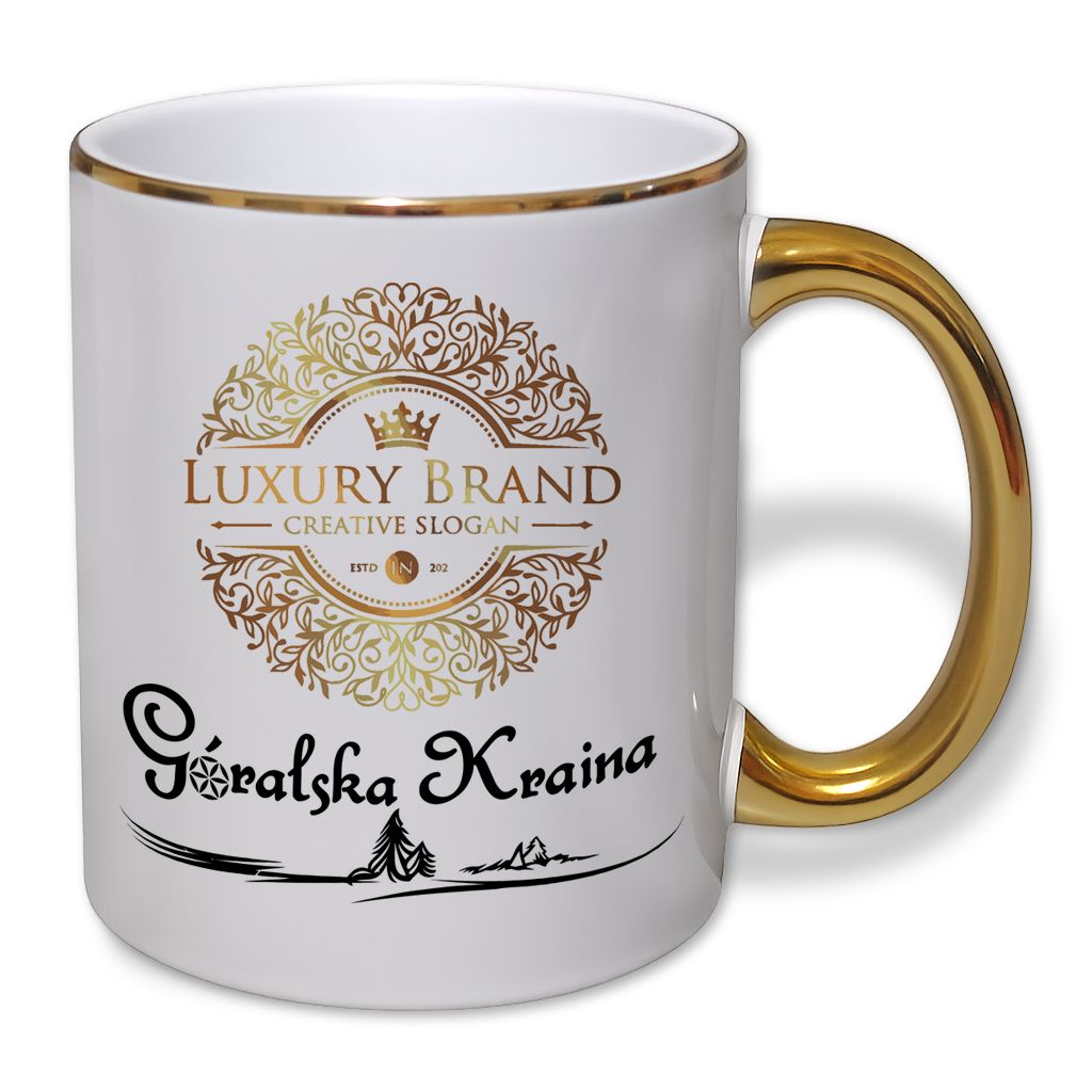 kubek z złotym uchem i nadrukiem