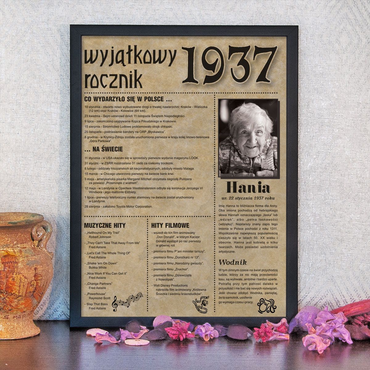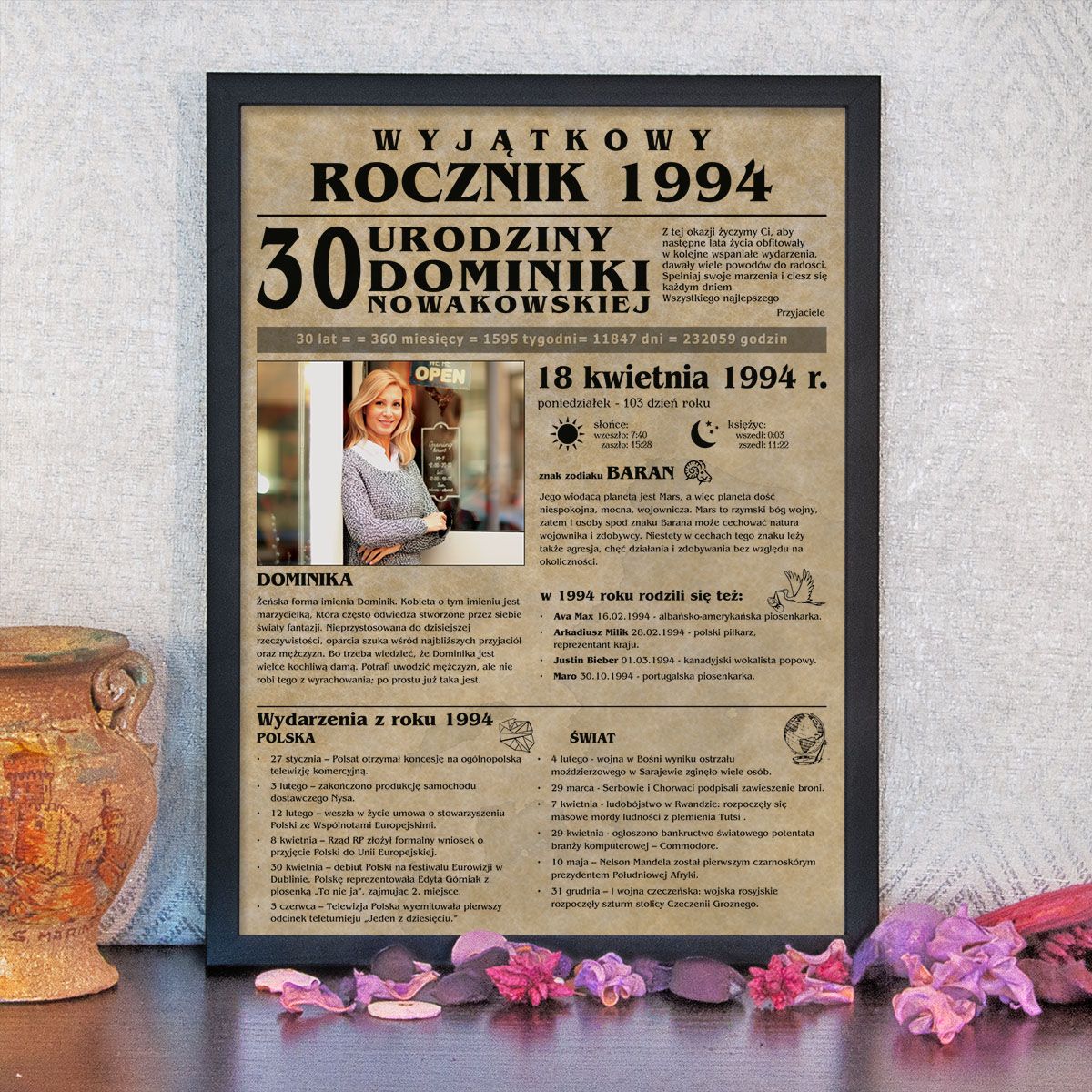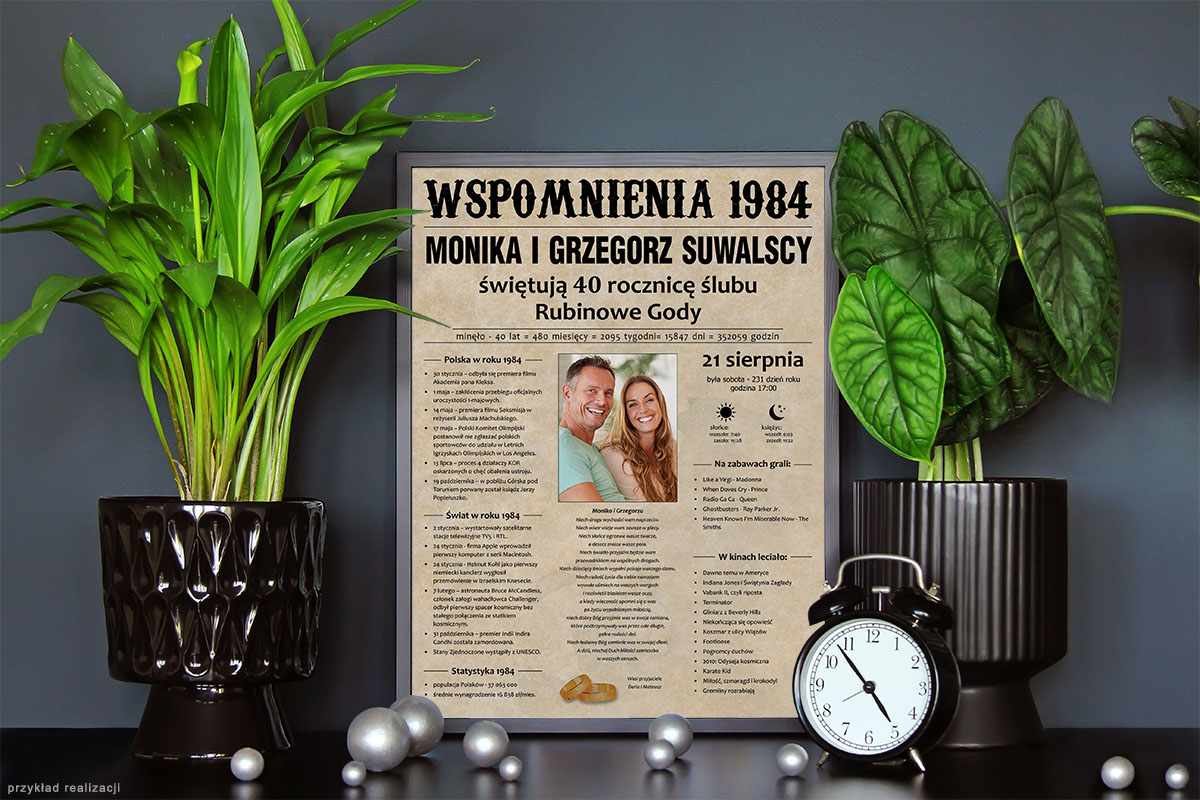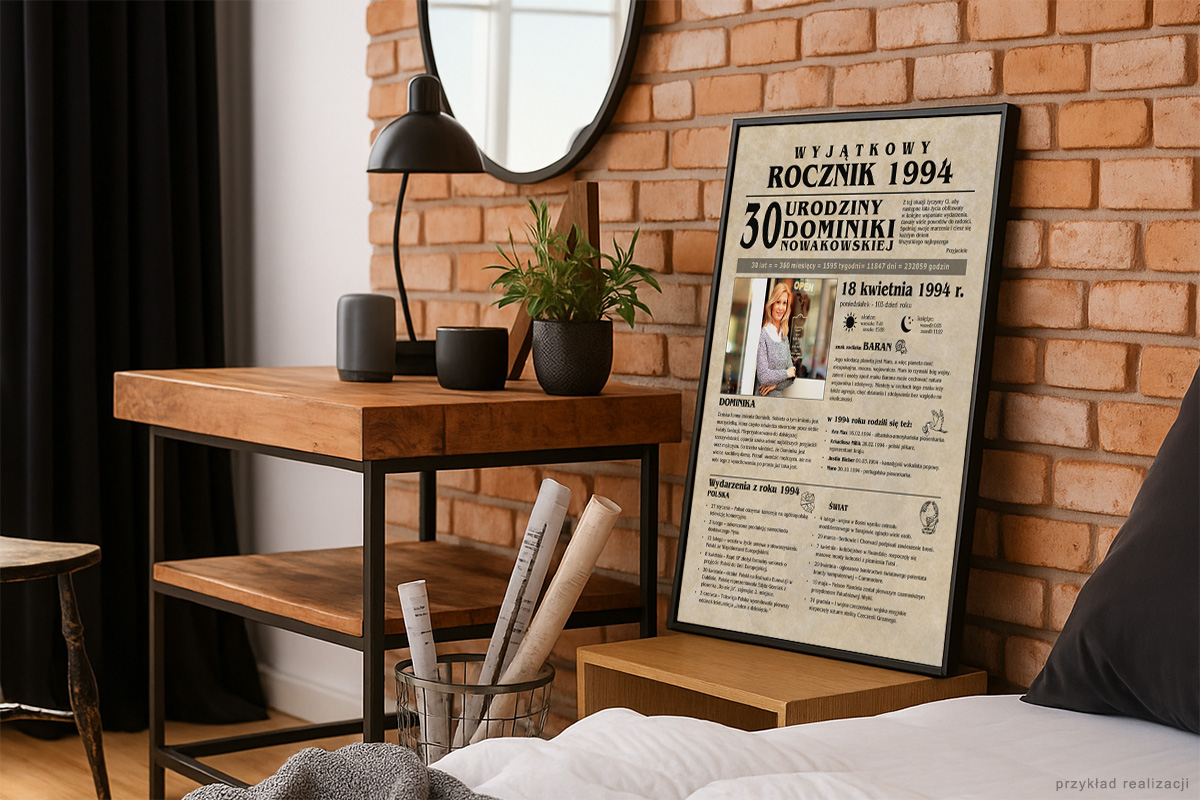 Wyjątkowy pomysł - plakat na urodziny lub rocznicę stylizowany na starą gazetę - rocznik z wybranego roku, oprawiony w ramę.W prosty i efektowny sposób możesz opowiedzieć co wydarzyło się w tym wyjątkowym roku. Ważne wydarzenia w Polsce i na świecie, muzyczne przeboje i popularne filmy, sprawiają że plakat stanie się interesującą podróżą w czasie i wyjątkową pamiątką, która bez wątpienia wzbudzi emocje obdarowanego.