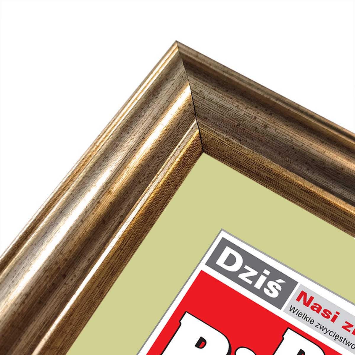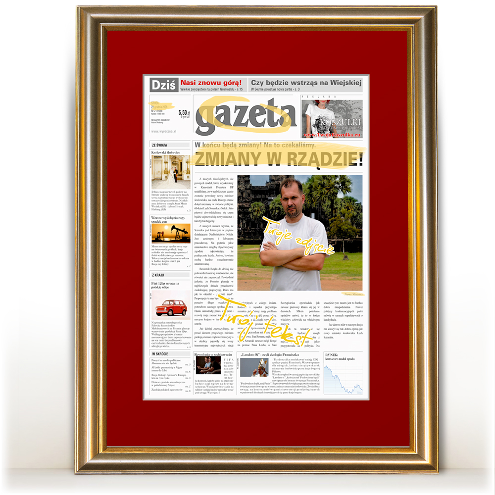 Gazetę drukujemy na specjalnym papierze "gazetowym". Całość zamknięta jest w ekskluzywnej złotej ramie z szybą i passe-partout w formacie 33,7x43,7 cm.