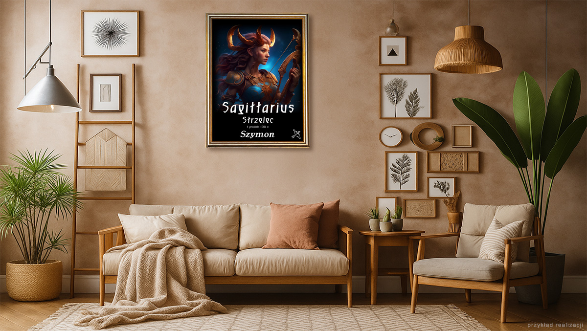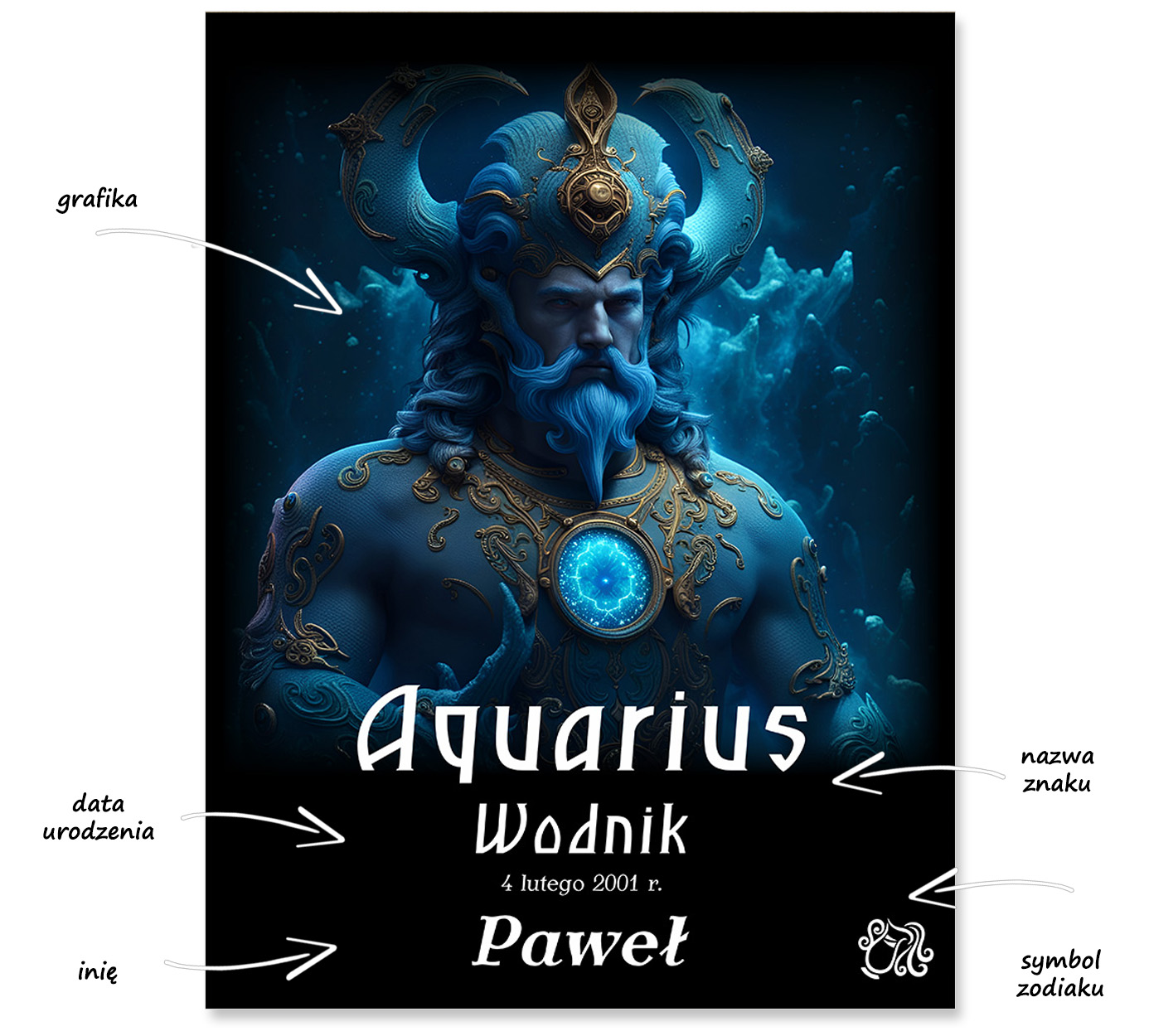 W prosty i efektowny sposób możesz opowiedzieć kilka słów o wyjątkowej osobie i związanym z nią dniem. Znak zodiaku, imię, wiązane z nim cechy osobiste czy charakteru lub żywioły, konstelacje gwiazd, sprawiają, że plakat stanie się interesującą podróżą w czasie i wyjątkową pamiątką, która bez wątpienia wzbudzi emocje.
