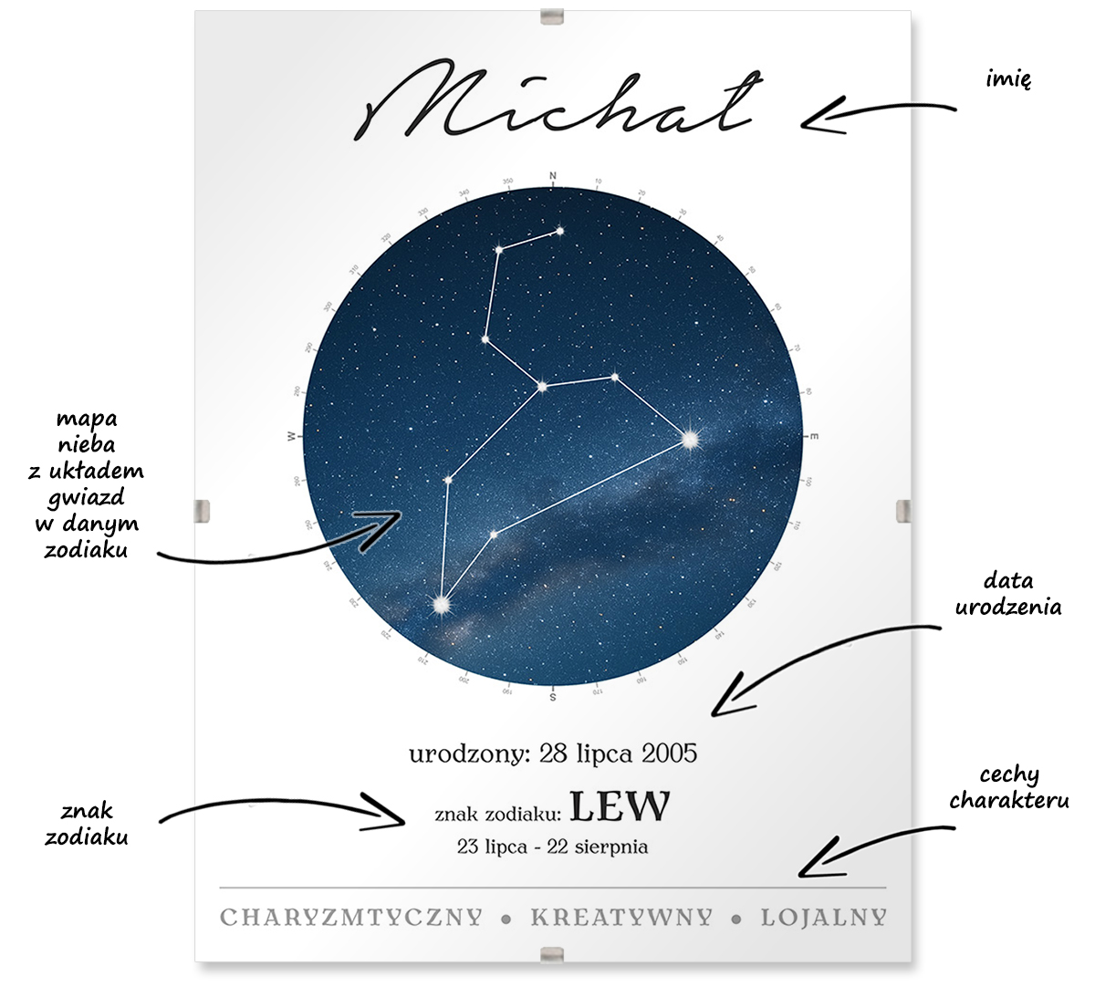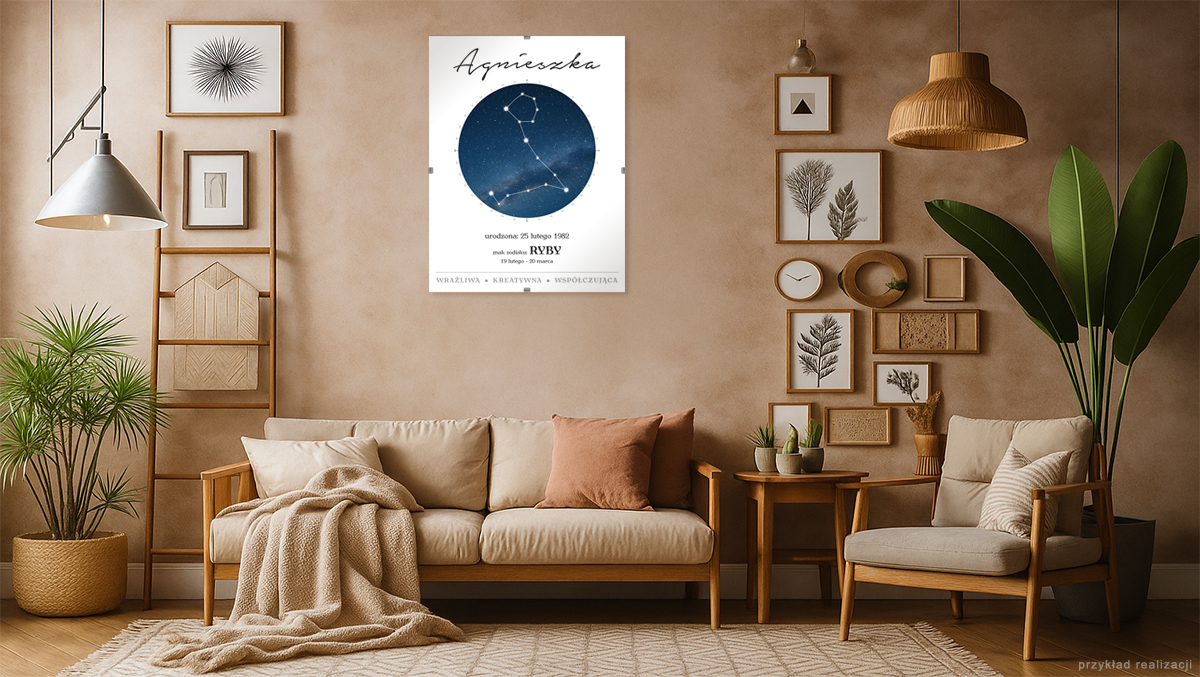 W prosty i efektowny sposób możesz opowiedzieć kilka słów o wyjątkowej osobie i związanym z nią dniem. Znak zodiaku, imię, wiązane z nim cechy osobiste czy charakteru lub żywioły, konstelacje gwiazd, sprawiają, że plakat stanie się interesującą podróżą w czasie i wyjątkową pamiątką, która bez wątpienia wzbudzi emocje.