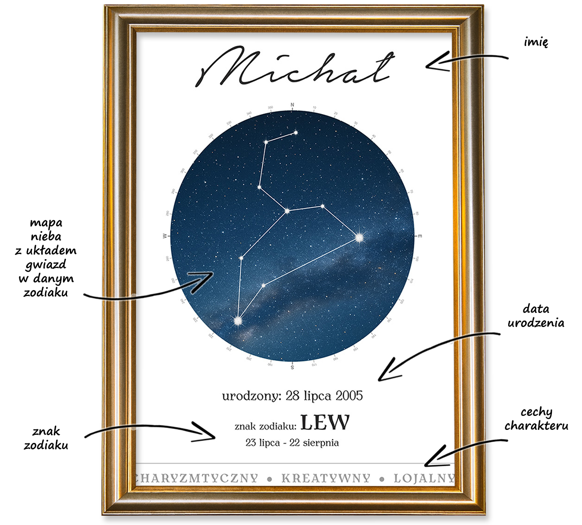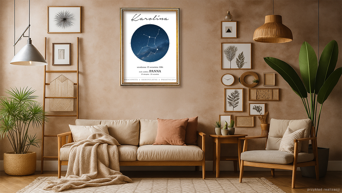 Możesz przesłać nam swoje teksty jakie mają znaleźć się na plakacie. Wystarczy, że podasz nam tylko imię i datę*, a my sami uzupełnimy resztę. U nas projekty robi profesjonalny grafik nie automat. Pamiętaj, że plakat może być dla dowolnego znaku zodiaku. Plakat drukujemy na wysokiej jakości papierze i oprawiamy w stylową złotą ramę i szkło.