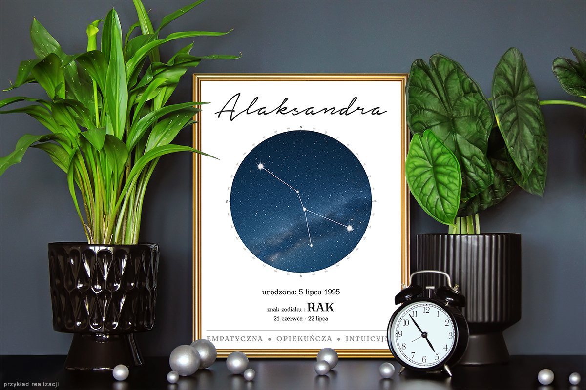 W prosty i efektowny sposób możesz opowiedzieć kilka słów o wyjątkowej osobie i związanym z nią dniem. Znak zodiaku, imię, wiązane z nim cechy osobiste czy charakteru lub żywioły, konstelacje gwiazd, sprawiają, że plakat stanie się interesującą podróżą w czasie i wyjątkową pamiątką, która bez wątpienia wzbudzi emocje.
